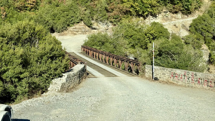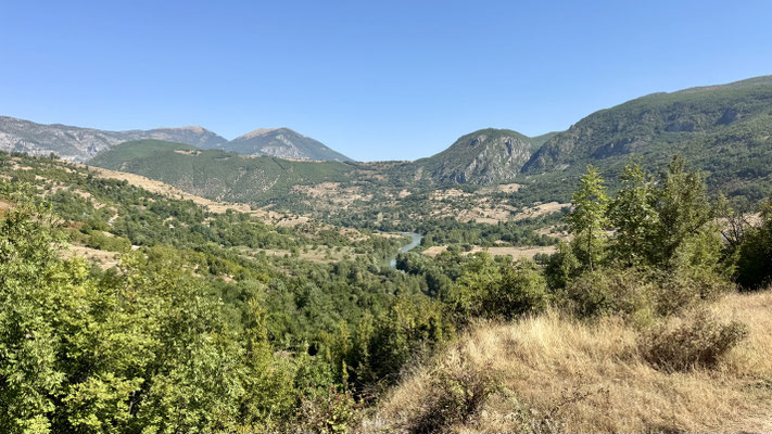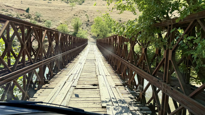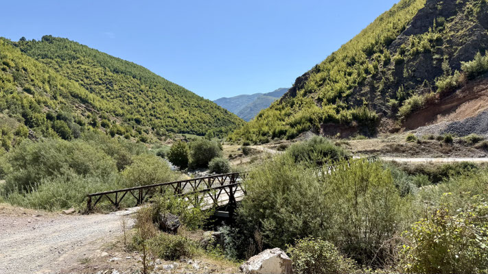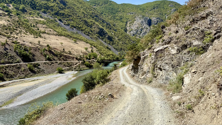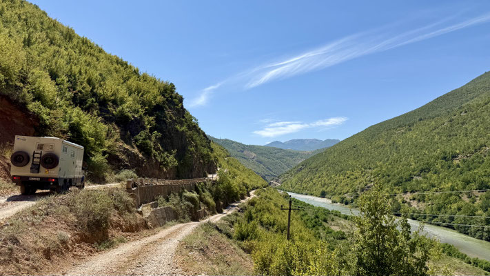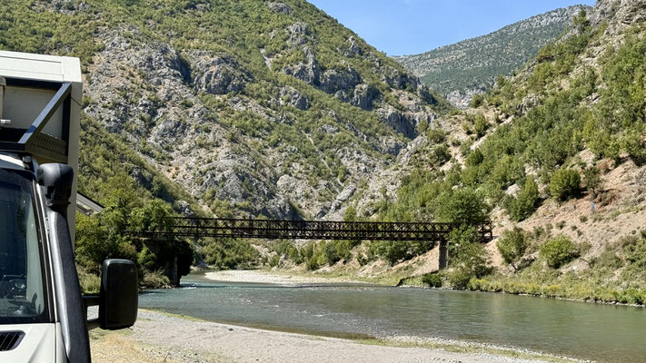 Um von Kukës nach Peshkopi zu gelangen, gibt es zwei Möglichkeiten: Teerstraße oder Piste. Wir haben uns heute für die Piste entschieden, denn diese Route führt entlang des Schwarzen Drin und ist landschaftlich sehr reizvoll. Immer wieder gab es schöne Aussichten ins Drin-Tal. Zunächst folgten wir der Schotterpiste am Hang entlang, Serpentinen brachten uns stetig bergab, manchmal war es schon eng zwischen Felsen und Abhang. Eine kleine Brücke überquerten wir, die Strecke führte uns zunächst weg vom Tal, wir kamen an einigen Häusern vorbei und mittels Serpentinen kamen wir wieder ins Drin-Tal. Über eine etwas längere Brücke, diesmal sogar mit Schild "8 Tonnen", wechselten wir die Flussseite. Die Holzbohlen auf der Metallbrücke klapperten ganz ordentlich beim Drüberfahren, die teilweise offensichtlich morschen Bretter haben wir ignoriert, und auch diese Brücke steht noch nachdem wir drüber waren! Kurz hinter der Brücke führte ein steiler Weg hinab zum Ufer und wir fanden einen schönen Übernachtungsplatz auf einer Kiesbank am Fluss Schwarzer Drin.