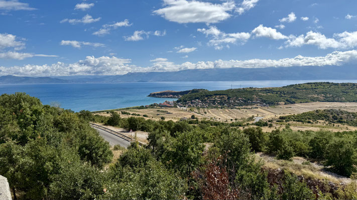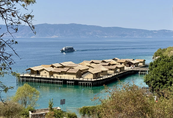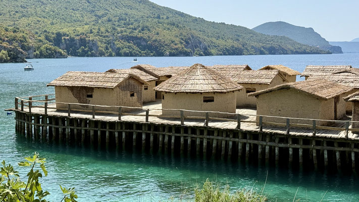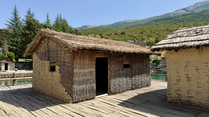 Unsere Weiterreise führte uns heute 104 Kilometer durch Nordmazedonien. Am Grenzübergang "Bllatë e Sipërme" wechselten wir ohne Wartezeit das Land. Die schmale R1201 führte uns dann vom Debar-Stausee am Schwarzen Drin entlang nach Struga und wir erblickten den Ohrid-See. Auf dem letzten Kreisel im Ort Ohrid lag eine Tankstelle, 1 Liter Eurodiesel kosten 1,10€, da tankten wir doch gerne voll und tauschten auch gleich mal 20€ in 1.200 Denar um, denn wir wollten bei Gradishte ein Pfahlbautenmuseum besichtigen.