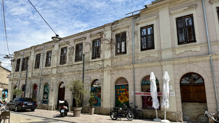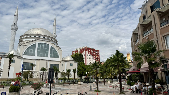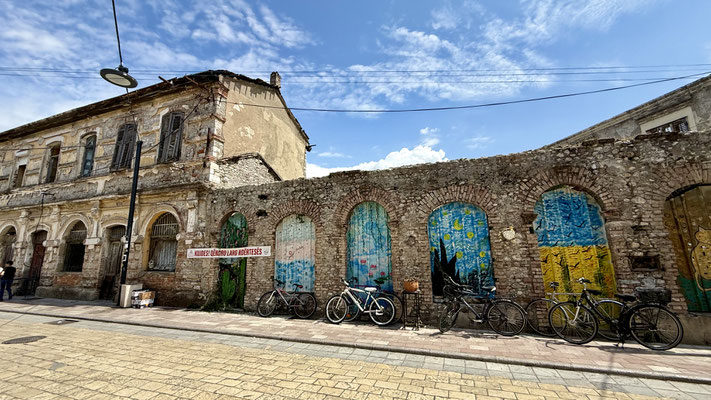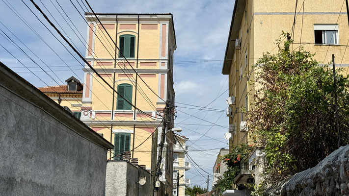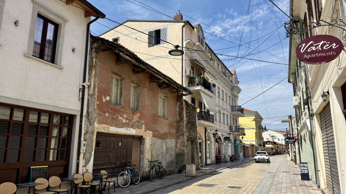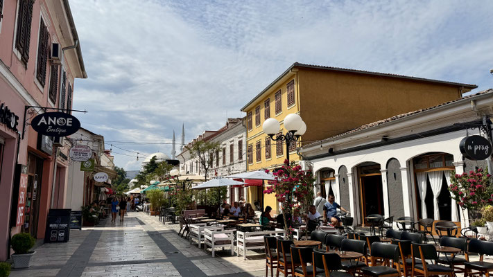 Es gibt zwei große Fußgängerbereiche mit gut besuchten Cafés und kleinen Geschäften. In der Mitte der Fußgängerzone stehen unechte Bäume, drumherum laden die Sonnenschirme zum Verweilen ein. Wir bummelten an vielen schönen Fassadenmalereien entlang. Viele Häuser waren nett anzusehen, aber dazwischen immer wieder alte, verfallenen Gebäude. Und die Kabel hängen wild und oft sehr tief über der Straße. Unsere ersten Albanischen Lek haben wir aus einem Geldautomaten geholt, die Gebühren für die Abhebung variieren je Bank. Sie liegen zwischen 7 Euro je Auszahlung und bis gehen zu 13% des abgehobenen Betrages.