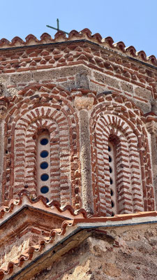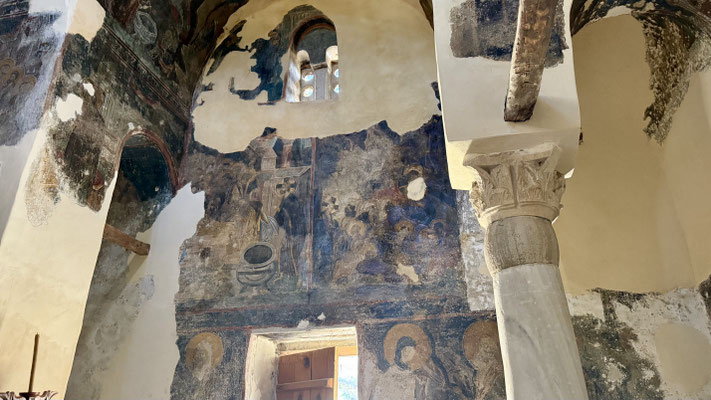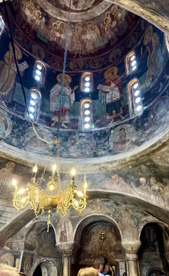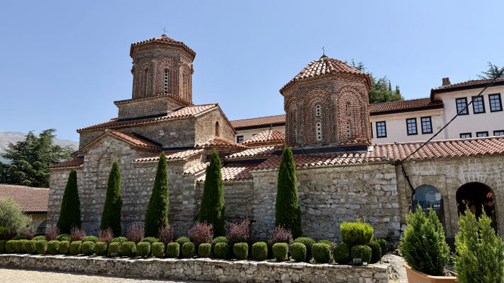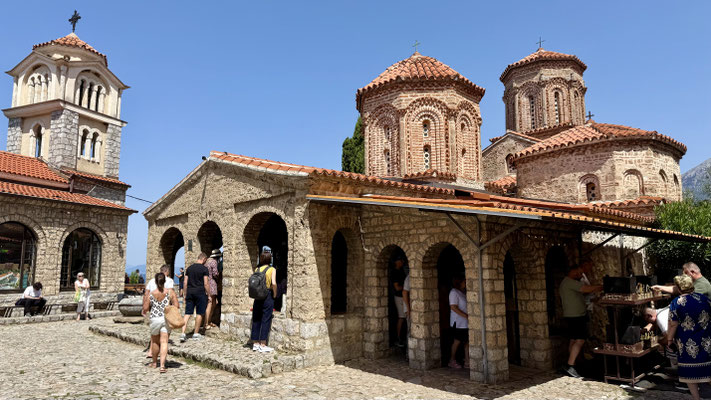 Ein paar Kilometer weiter steht das Kloster Sveti Naum am Ohridsee. Der Grundstein für das Kloster wurde von einem Mann namens "Naum" um das Jahr 895 gelegt und war in der Vergangenheit ein Wallfahrtsort. Heute ist eher ein Park mit Rasen und schön geschnittenen Sträuchern. Man kann sich Liegen mieten und im Ohridsee wird gebadet. Auf der anderen Seite des Weges befindet sich eine Budenstadt aus Souvenirläden und Verpflegungsständen. Die Klosterkirche ist eine dreischiffige Kreuzkuppelkirche und von außen sehr schön. Das Innere der Kirche ist voller Fresken, die Szenen aus dem Leben Naums sowie anderer Slawenapostel darstellen.