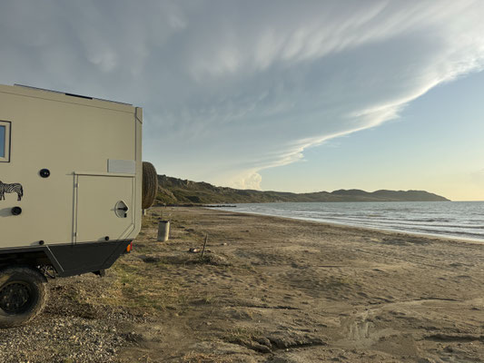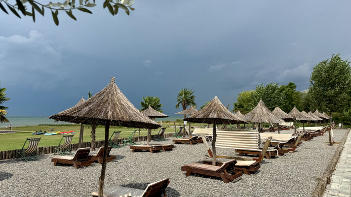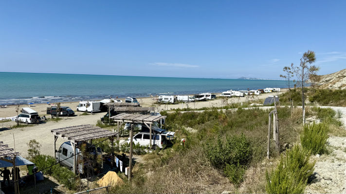 Deshalb bummeln wir weiter Richtung Fährhafen und haben uns den Strand "Plazhi i Bardhe" ausgesucht, der zu einem Campingplatz gehört. Die Stellplätze sind nur 20 Meter vom Wasser des Mittelmeeres entfernt und der Strand ist ein Sandstrand. Und so haben wir beschlossen, die Zeit bis zur Abreise hier zu verbringen und machen mal zwei Tage Badeurlaub.