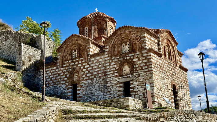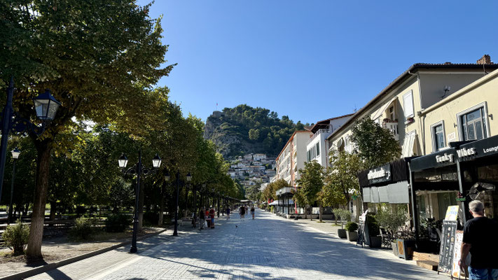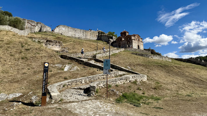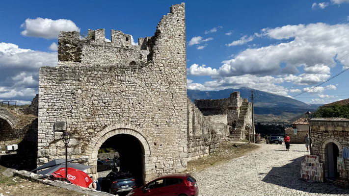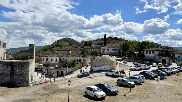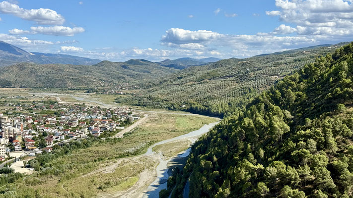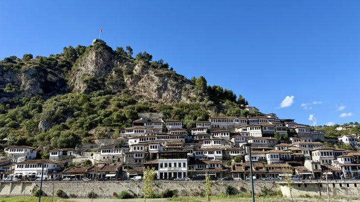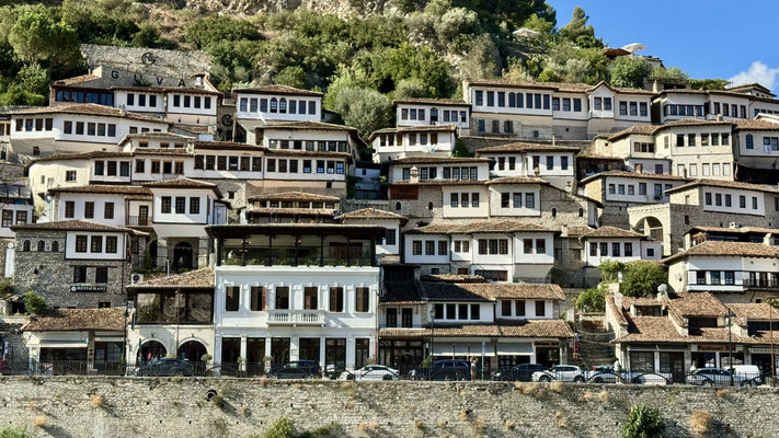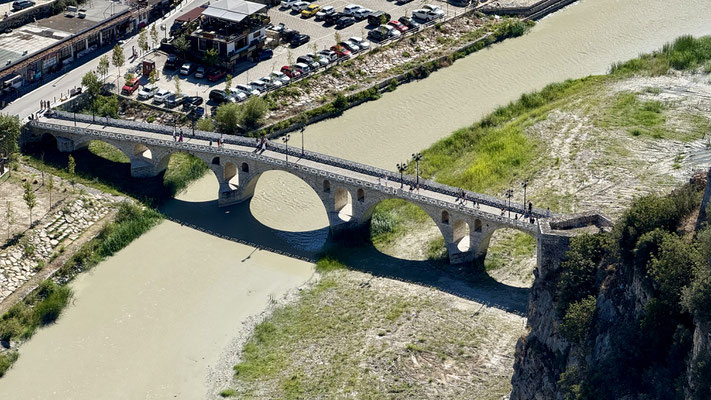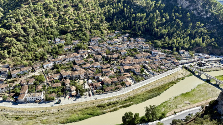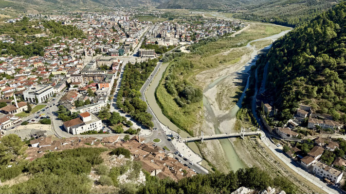 Nun ging es ohne Unterbrechung weiter bis nach Berat, die am Fluss Osum liegt. Sie ist seit 2008 Unesco-Welterbe und wird auch "Stadt der tausend Fenster" genannt, weil die Häuser im Viertel Mangalem sehr dicht stehen, die Fassaden haben zum Tal hin alle große Fenster. Diesem Viertel verdankt deshalb die Stadt ihre Bezeichnung „Stadt der tausend Fenster“. Aber bevor wir diesen Blick hatten, haben wir die Burg besucht. Die Stadt Berat wurde ursprünglich als Festung auf dem etwa 200 Meter hohen Hügel erbaut. An dieser strategischen Stelle thront die Burg, die nicht nur aus den befestigten Anlagen besteht, sondern einen ganzen Stadtteil mit zahlreichen Kirchen und Moscheen umfasst. Auch Autos fahren dort auf den schmalen, holperigen gepflasterten Straßen. Dazwischen laufen die Besucher, die sich die ehemalige Burganlage ansehen. In die "Kirche der Heiligen Dreifaltigkeit" (Shën Triadha) konnten wir einen Blick werden. Es gibt neben vielen kleinen Lokalen, in denen traditionelle albanische Speisen angeboten werden mindestens ebensoviele Souvenirläden mit handgewebten Teppichen oder gehäkelten Tischdecken. Von der Aussichtsplattform blickten wir auf die Stadt, den Fluss Osum und die Berge im Hintergrund. Um zu der Fußgängerbrücke über den Fluss zu gelangen, ging es einen steilen unbefestigten Pfad hinunter, nach 25 Minuten standen wir auf der Brücke und konnten die Häuser am Hang betrachten.