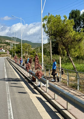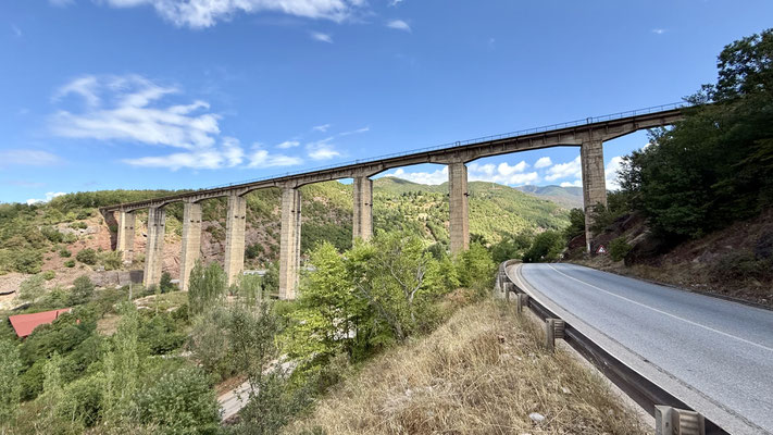 Die 135 km entfernte Stadt Berat war heute unser Ziel. Oberhalb der Ortschaft Lin haben wir nochmal einen letzten Blick auf den Ohridsee geworfen. Bei dem Aussichtspunkt gab es mehrere Verkaufsstände mit Nüssen, Honig uns Souvenirs. Auch Zwiebeln und Kartoffeln waren am Straßenrand zu kaufen. Unterwegs haben wir noch zwei Stopps gemacht. Zuerst kam das mit 48 Metern höchste Eisenbahnviadukt, fehlte eigentlich nur der Harry-Potter-Zug. Aber zum Glück warteten wir nicht, denn später stellten wir fest, dass die Gleise einfach im Sand verschwunden waren.