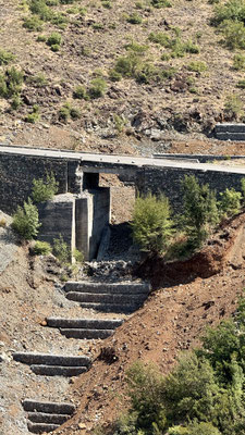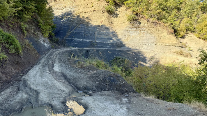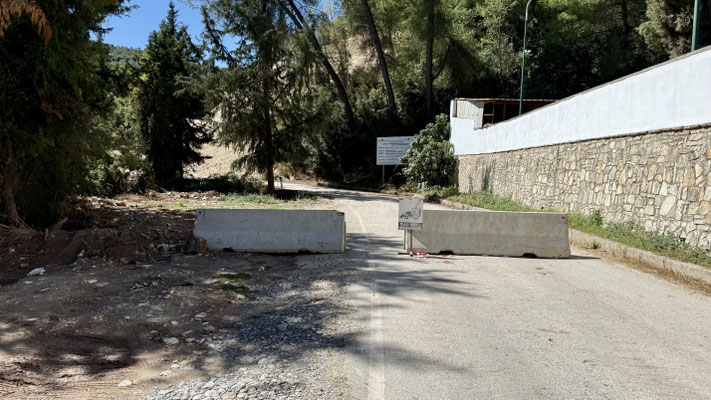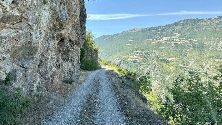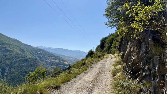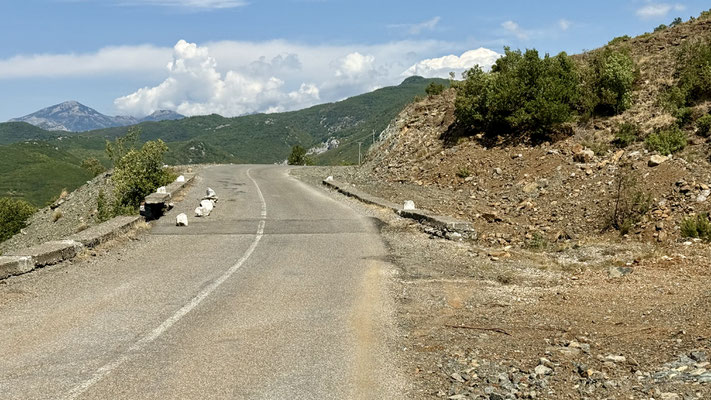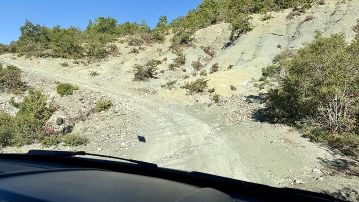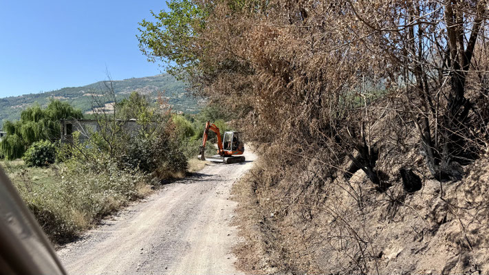 Vom Ort Berat wollten wir eine Pistentour bis nach Këlcyra machen. Bis zum Supermarkt lief es wie geplant. (1,5 km). Zwei Kilometer später war aber schon die Auffahrt auf den ersten Hügel durch Betonteile versperrt. Hinweis zwar auf eine Baustelle, aber kein Hinweis, wie man weiterkommt. Zum Glück hatten wie eine Alternativroute in petto. Zwar etwa kniffliger zu fahren, aber egal.