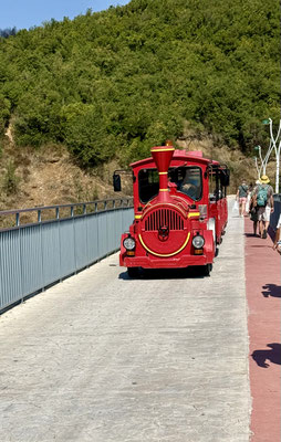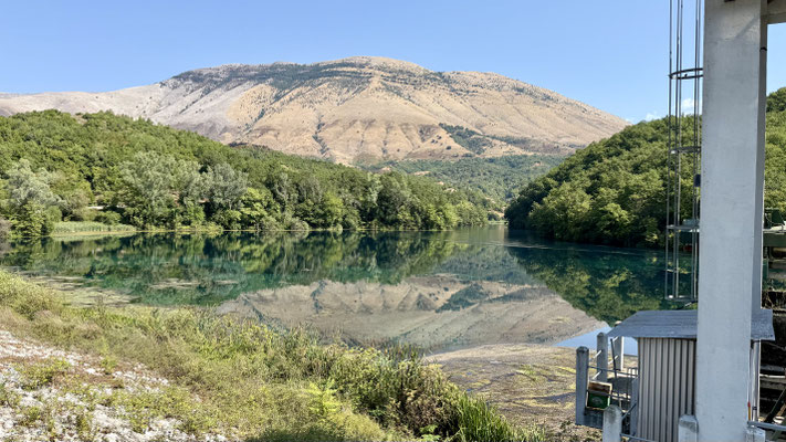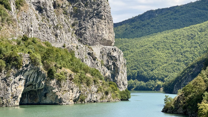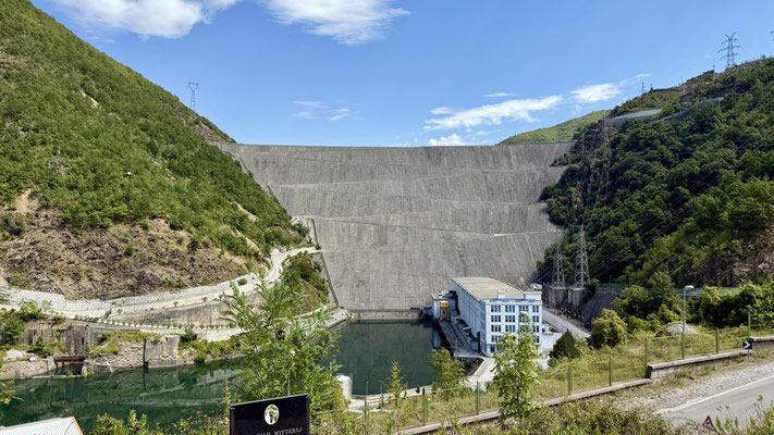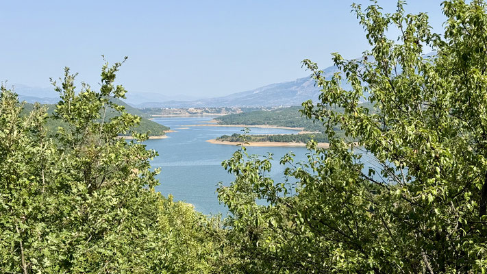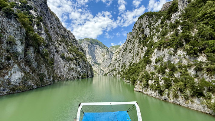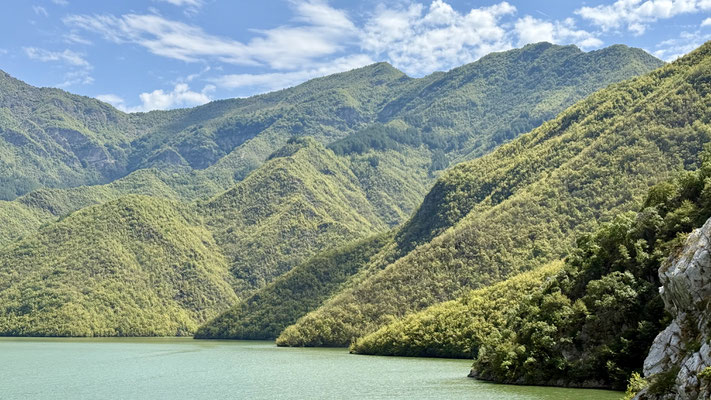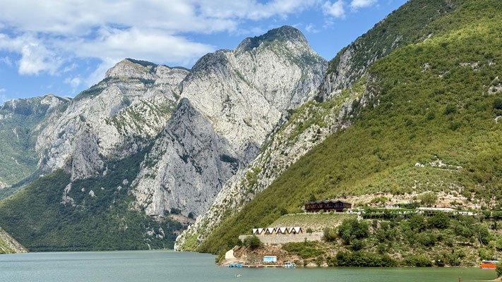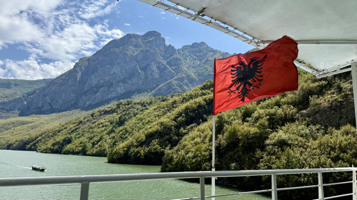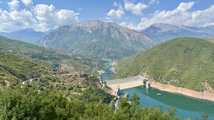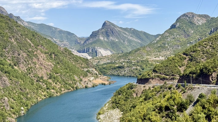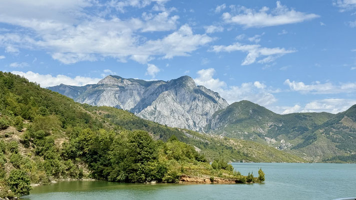 Der 285 km lange Fluss "Drin" entsteht bei der nordostalbanischen Stadt Kukës aus dem Schwarzen und dem Weißen Drin, deren Quellen in Nordmazedonien bzw. im Kosovo liegen. Der Drin durchquert die Nordalbanischen Alpen westwärts und wird fast ausnahmslos gestaut. Am Vau-Deja-Stausee sind wir schon gestern entlang gefahren, der mittlere ist der Koman-Stausee und dann kommt der Fierza-Stausee. Sie werden zur Energiegewinnung gestaut, ein Projekt aus den 1970er und 1980er Jahren, finanziert mit Hilfe der Chinesen.