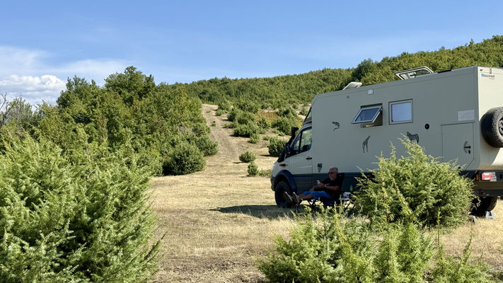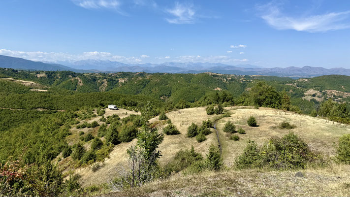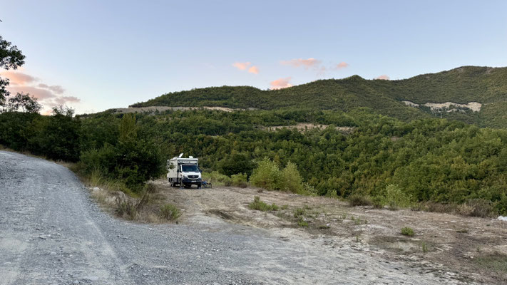 Wir fuhren bis zum Ende der Straße, dann fing die Piste an. Da es schon Nachmittag war, parkten wir daneben für die Nacht. Es waren zwar nur 65 km ab Berat, aber die vielen Kurven machen die Fahrerei langsam.