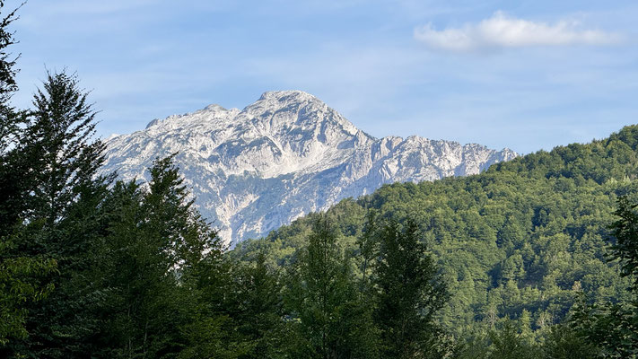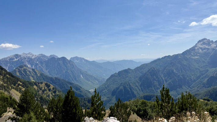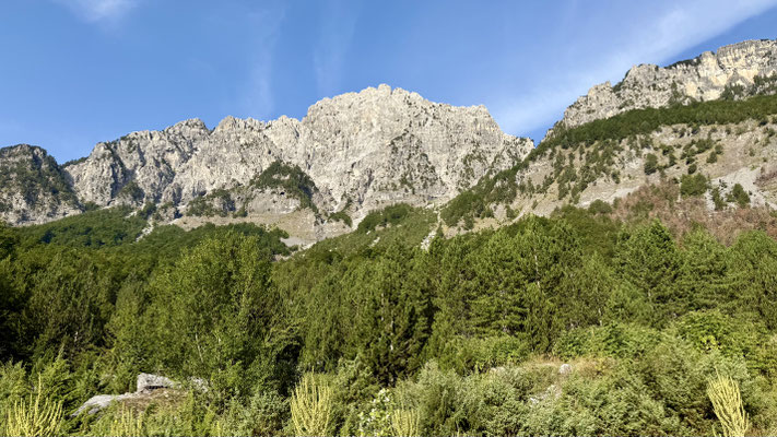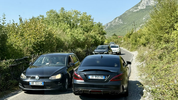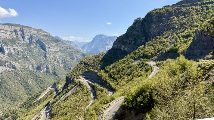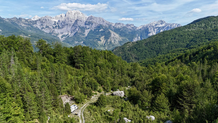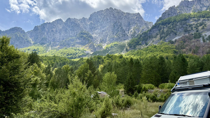 In einer Kehre biegen wir auf einen schmalen Weg, auf einem kleinen Plätzchen bleiben wir für die Nacht und blicken auf die gezackten Gipfel der albanischen Alpen. Hier ist unser Endpunkt für diese Strecke erreicht. Noch weiter hinunter ins Tal zum Streudorf Theth wollen wir nicht, die Stromleitungen sollen sehr tief hängen. In den letzten Jahren ist der Tourismus stark gewachsen und zieht vor allem Wanderer an.