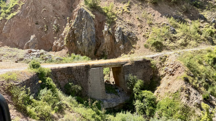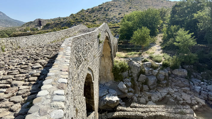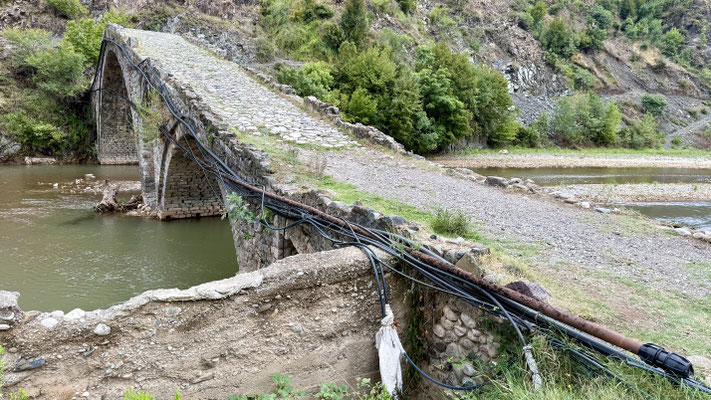 Danach hielten wir an der Hauptstraße SH3, gingen durch den kleinen Ort Mirakë zur "Kamara's Bridge", einer alten osmanischen Steinbrücke aus dem Jahre 1715. Sie ist asymmetrisch, auf drei grauen Steinbögen gebaut, mit bootförmigen Entwässerungsöffnungen. Die Gesamtlänge beträgt 40 m, die Breite 3,5 m und die Hauptspannweite 23 m. Aber so historisch wertvoll scheint sie für Albanien nicht zu sein, jede Menge Kabel/Schläuche sind an einer Seite der Brücke befestigt.