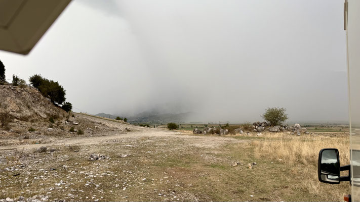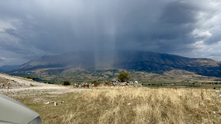 Nach all dem Stadt Trubel war uns mal wieder nach etwas Ruhe. Wir sind von Gjirokastra nur etwa 20 km südlich gefahren und verbringen den Tag (und die Nacht) auf einem Platz abseits der SH4 mit Blick auf die umliegenden Berge. Ab Nachmittag kamen dann die ersten dunklen Wolken. Da wir etwas erhöht am Hang stehen, können wir sie perfekt ankommen sehen. Abends haben wir dann ein dreistündiges Gewitter, teilweise direkt über uns, erleben dürfen.