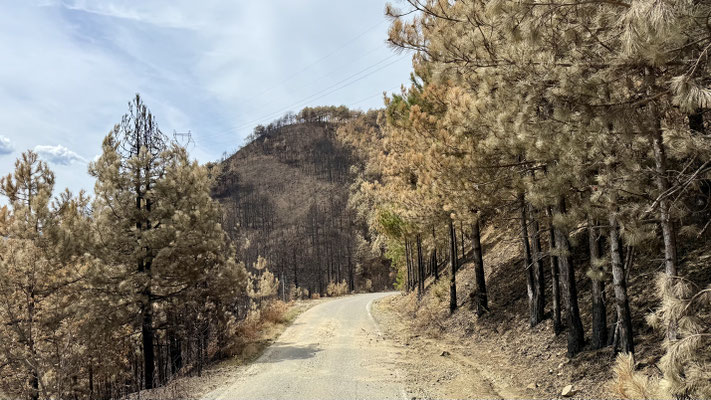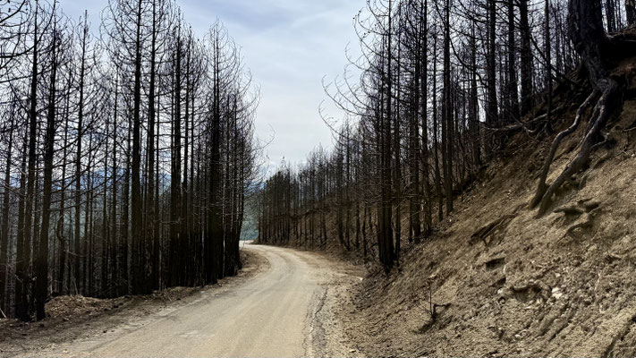 Unterwegs kamen wir durch ein größeres Gebiet in dem es Feuer gegeben hat. Die verkohlten Bäumen waren das sichtbarste Zeichen, aber auch ein Brandgeruch lag noch in der Luft. Glücklicherweise brannte aber nichts mehr. Wir kamen dann auch an einem riesigen Firmengelände nebst Erweiterungs-Baustelle vorbei, bzw. die Hauptstraße führte mitten durch das Firmengelände. Die Firma füllt Wasser in Flaschen. Schon kurios, so mitten im nirgendwo. Und die paar LKW, die wir da haben wegfahren sehen, erklären ein keinster Weise die riesigen Gebäude.