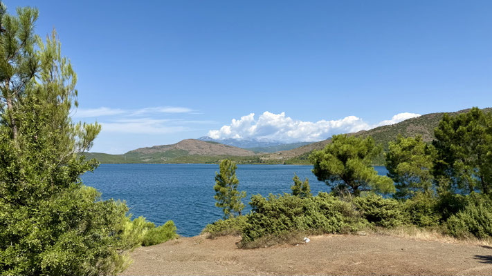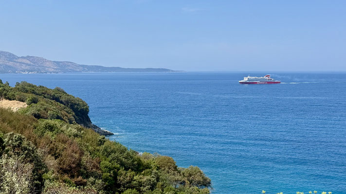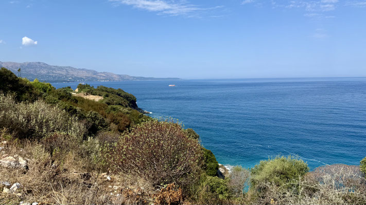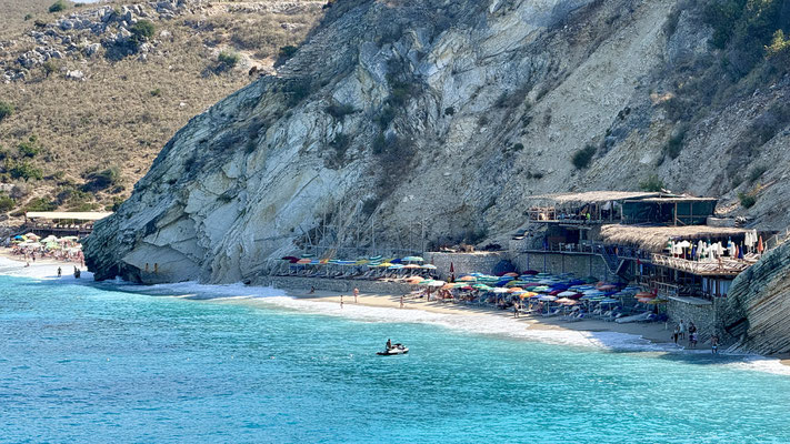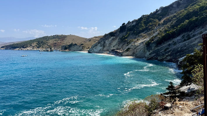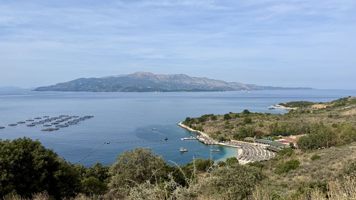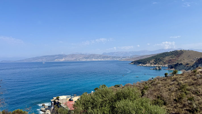 Also ging es dann durchs quirlige Örtchen Ksamil (eine Touristenhochburg) bis zum "Pulëbardha Beach". Hinab führt eine Schotterstraße und die vielen PKW werden fast über die unebene Piste getragen, denn sie haben nicht so sehr viel Bodenfreiheit. Der Kiesstrand liegt am Fuß einer Steilküste mit türkisem Wasser, Liegestühlen und einem Restaurant. Da gab es sogar noch freie Parkplätze. Aber irgendwie war es das nicht. Beim Hinauffahren entdeckten wir neben der Piste eine kleine Haltebucht, das ist jetzt unsere. So eine schöne Aussicht auf die (Wasser-) Straße von Korfu. Auf der einen Seite sehen wir die Hafenstadt Saranda (Albanien) und schauen wir zur anderen, so ist die griechische Insel Korfu zu sehen, die nur wenige Kilometer entfernt ist.