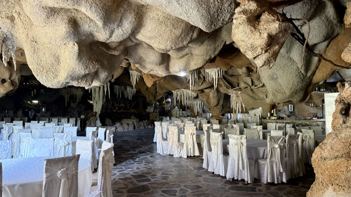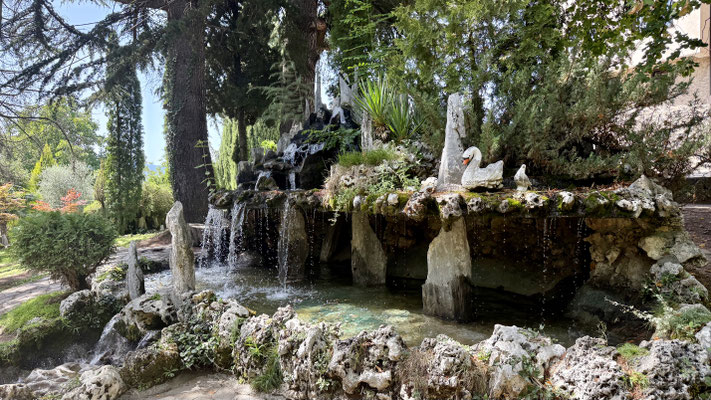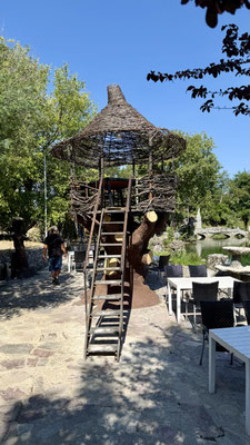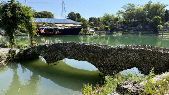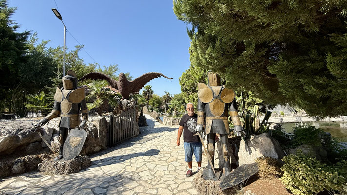 Wir fuhren zurück über Shkodra und nahmen die SH5 bis nach Mjede. Dort gibt es "DEA", eigentlich ein Hotel/Restaurant, aber mit kurioser Gartenanlage um einen Teich herum. Am Eingang fallen die Ritterrüstungen auf, dann blickt man auf den großen See, um den man herumlaufen kann. Dort stehen auch aus Beton gebaute Baumhäuser, jeweils mit Tisch und Sitzgelegenheiten auf der Plattform. Für Kinder gibt es jedoch nur eine alte Schaukel. Für Hochzeiten steht ein als Tropfsteinhöhle gestalteter Raum zur Verfügung und auch das Restaurant ist besonders eingerichtet . Für ein Essen waren wir zu früh, gibt es erst ab 12 Uhr, aber ein O-Saft und Espresso erfrischten uns im Schatten.