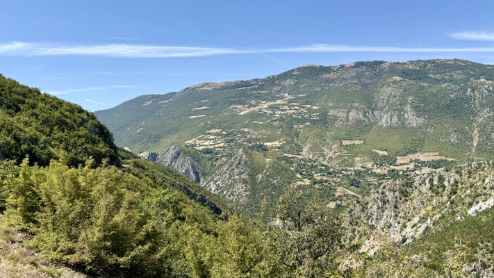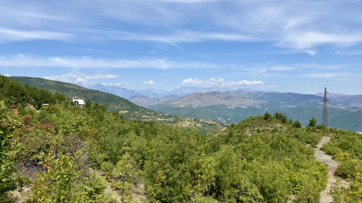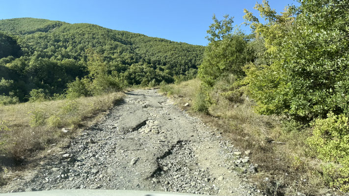 Als alles soweit wieder verstaut war, kamen zwei Schafhirten an. Mit Händen und Füßen und einer Straßenkarte auf dem IPad klappte die Verständigung. Sie meinten, der Weg nach "Sukë" wäre besser als der von uns geplante Weg nach "Ballaban". Ob das wirklich so war, wissen wir nun nicht. Jedenfalls ging es auf etwas besserer Piste abwärts, zwischendurch waren wir schon auf über 1.000 Höhenmetern. Eine falsche Abzweigung hatten sie uns genannt, erst mussten wir unter einem sehr tief hängenden Wasserschlauch durch, den wir mittels eines Besens anhoben. Dann kamen wir in eine Ansiedlung, das war aber Sackgasse. Wenden auf kleinstem Raum, nochmal unter dem Wasserschlauch hindurch, dann aber den richtigen Abzweig bis hinunter zum Dorf Sukë genommen. Nach 3 Stunden waren wir wieder auf einer "ordentlichen" Straße unterwegs.