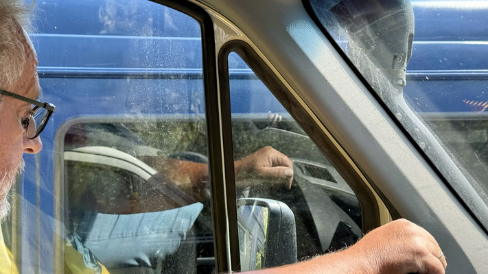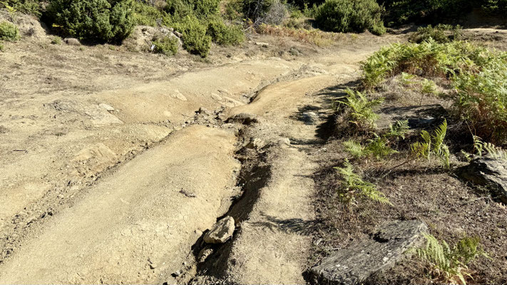 Schließlich erreichten wir eine Kreuzung, bei der wir erstmal die falsche Richtung erwischten. Also rückwärts rangiert, bei dem ausgewaschenen Untergrund nicht so einfach. Dann rechts abgebogen. Dabei haben wir einen Betonklotz touchiert, es gab einen lauten Knall, der Reifensensor piepte hektisch.