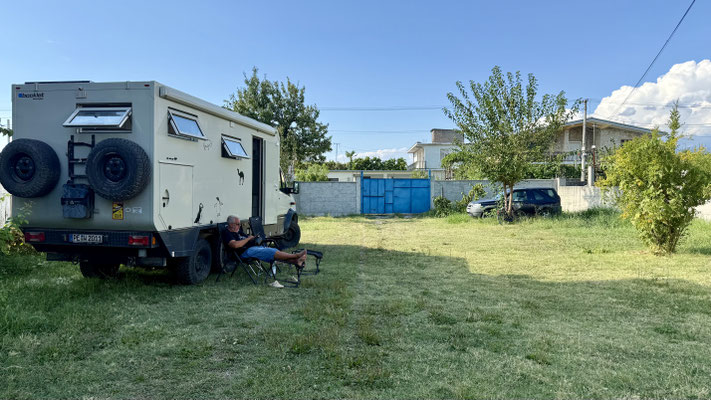 Vor zwei Tagen hatten wir keinen gescheiten Parkplatz im Ort Shkodra gefunden, deshalb sind wir heute zu einer privaten Unterkunft in Shkodra gefahren, bei der wir im Gartenbereich in unserem Heim übernachten können. Von hier aus sind es nur 15 Minuten zu laufen, dann ist man in der Innenstadt.
