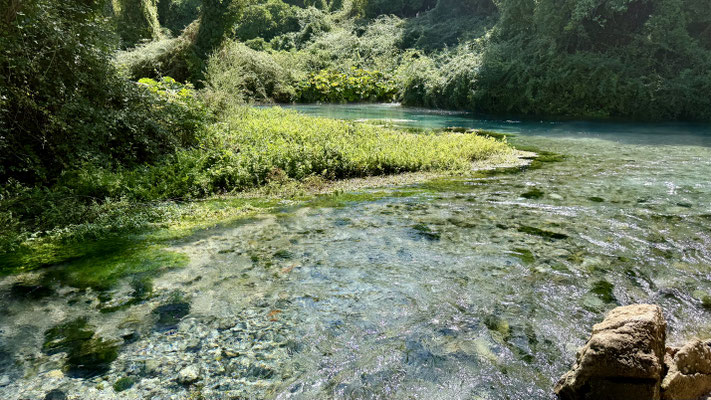 Die unmittelbare Umgebung steht unter Naturschutz und ist durch Eichen- und Platanenhaine gekennzeichnet. Erst seit 2022 gibt es einen großen Parkplatz außerhalb des Schutzgebietes und man geht, wie wir, zu Fuß die 1,8 km bis zur Quelle. Oder man fährt mit einem der zahlreichen angebotenen Roller oder der kleinen Bimmelbahn bis dahin.