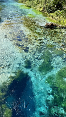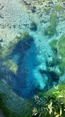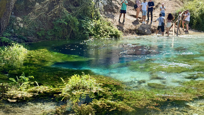 Einen tollen Zwischenstopp hatten wir heute. Wir besuchten die Karstquelle "Syri i Kaltër" (Blaues Auge), die wasserreichste aller 18 Quellen, die in einem See gestaut werden. Das Wasser des Blauen Auges sprudelt mit hohem Druck aus einem unterirdischen Quelltopf hervor. Das schöne Türkis des Wassers entsteht im Sonnenlicht vor dem Hintergrund des hellen Kalksteins. Von einer Plattform kann man direkt darauf schauen. Es ist so beeindruckend, mit welcher Menge das Wasser sprudelt. Zum Glück ist mittlerweile das Springen in den Quelltopf verboten.