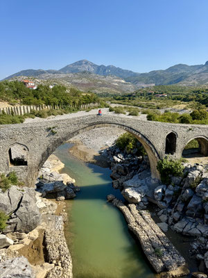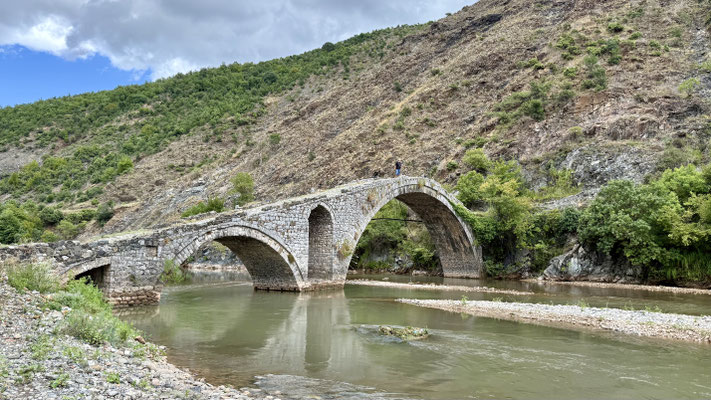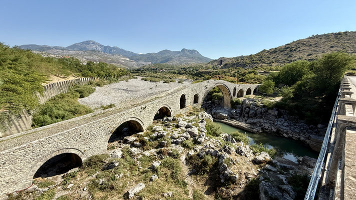 Östlich von Shkodra haben wir uns die "Ura e Mesit" (Brücke von Mes) angesehen. Das ist die am besten erhaltene und größte Steinbrücke aus der osmanischen Zeit. Sie wurde 1768 von Mehmet Pashe Bushati gebaut und lag auf dem alten Handelsweg von Shkodra bis in den Kosovo. Die Brücke hat 13 Brückenbögen, ist 108 Meter lang und etwa 3,40 Meter breit. Der mittlere Brückenbogen überspannt den Fluss Kir. Als Fußgänger kann man die Brücke benutzen, für die Fahrzeuge gibt es eine neue Brücke daneben.