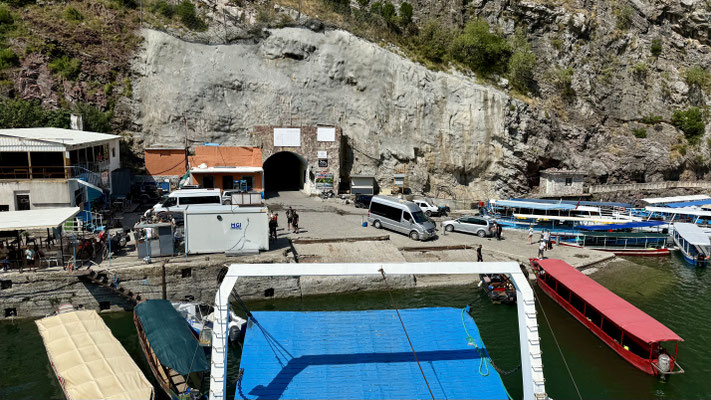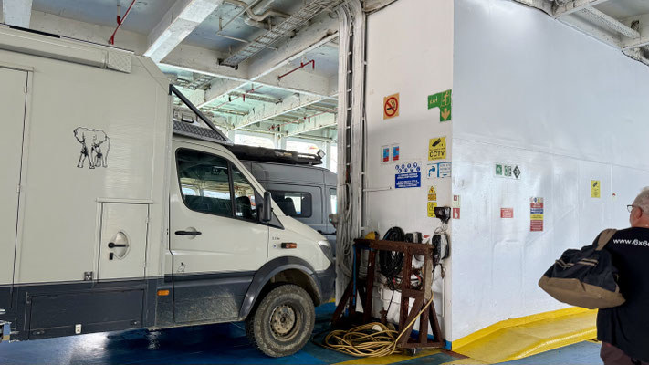 Und das haben wir heute gemacht. Wir mussten auf dem Weg zur Autofähre durch einen engen, grob aus den Felsen gehauenen Tunnel fahren. Kommt man aus dem Tunnel, ist man schon fast auf der Fähre. Der Preis für die Fähre ergibt sich aus den Quadratmetern, die man platzmäßig beansprucht plus die Anzahl der Personen.