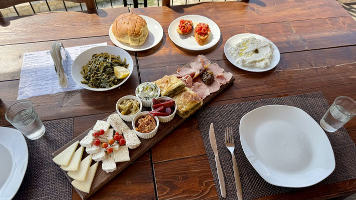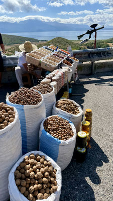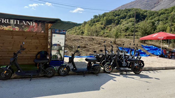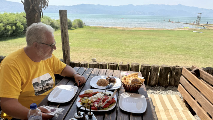 Das nächste Dorf mit Einkaufsmöglichkeit liegt etwa 4 km entfernt, aber als Service für die Camper kommt nachmittags der Obst-/Gemüsemann und baut seinen Stand auf. Für morgens kann man sich Brot bestellen, was in Albanien immer ein Weißbrot ist. So sind wir recht gut versorgt.