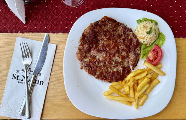 Im Restaurant bestellten wir einen Mazedonischen Hamburger und waren erstaunt, dass nur das flache Hacksteak ohne Hamburger-Brötchen kam. Aber es hat uns sehr lecker geschmeckt.
