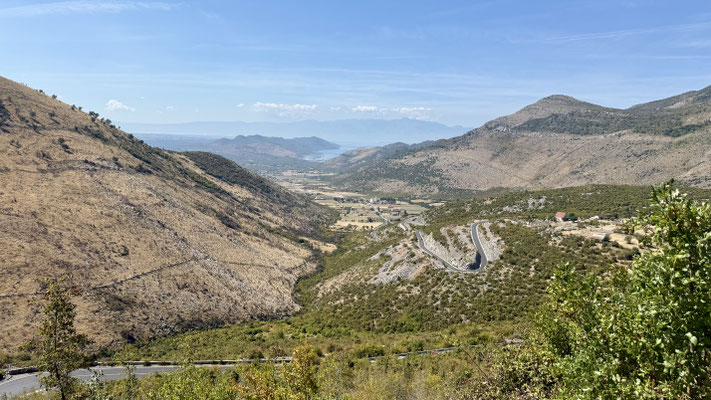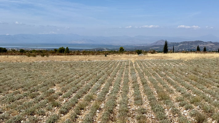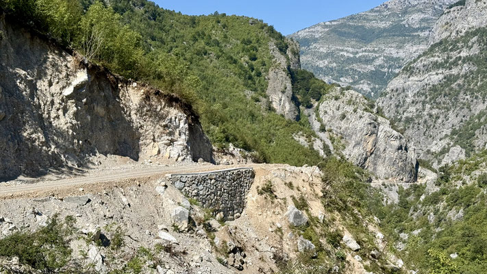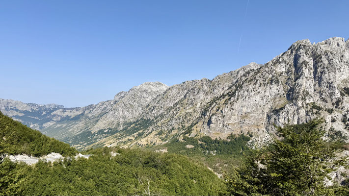 Zurück aus diesem Tal ging es auf der SH20 bis nach "Han i Hotit" und dort unter einer Eisenbahnbrücke hinduch (nur 3,50 m hoch und aus unserer Richtung kein Hinweisschild, aber wir wussten bereits von dieser Durchfahrtshöhe). Bis dahin hatten wir schon jede Menge eindrückliche Serpentinen hinter uns gebracht. Ein erster Blick auf den Skutari-See und weiter ging es hinab. Dann bogen wir Richtung "Theth" ab und passierten einige, leider schon abgeerntete Lavendelfelder. Die schmale, nur 1 1/2 Spuren breite Asphaltstraße windet sich mit aufwändig an den Berghang gebauten zahlreichen (für uns sehr engen) Serpentinen hinauf bis zum 1630 m hohen Terthorja-Pass, der bis ins späte Frühjahr schneebedeckt ist. Entlang der Straße stehen jetzt urige Kiefern und Laubbäume. Dadurch kaum noch Sicht auf die Berge.