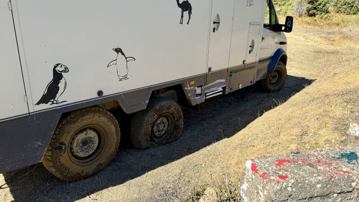 Schaden: Der mittlere rechte Reifen war platt, an der Seite durch einen scharfen Stein aufgerissen. Leider ist auch der Bereich unter unserer Eingangstür zur Kabine durch den Betonklotz beschädigt worden. Das wird dann daheim repariert. Den kaputten Reifen hat Uli vor Ort gewechselt. Zum Glück haben wir ja immer zweimal Ersatz dabei. Wobei der kaputte Reifen nicht mehr zu flicken ist, aber, der wurde in Kapstadt montiert, hat sich also wacker gehalten!