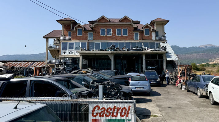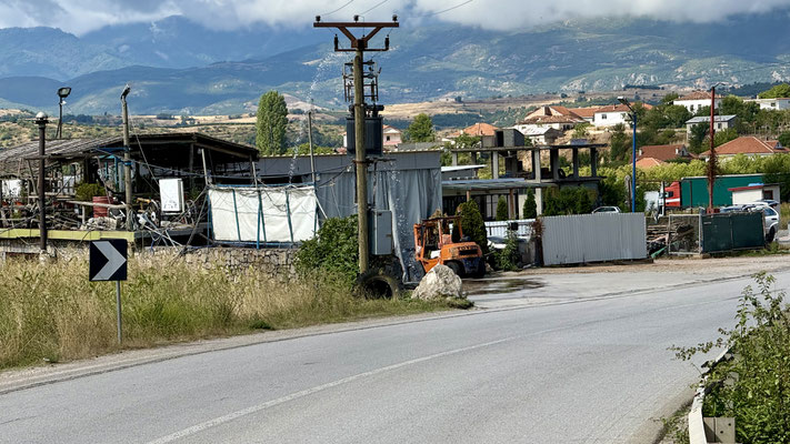 Wir sind kurz nach Kukës abgebogen, weil wir im Supermarkt einkaufen wollten. Unser Auto ist eindeutig zu groß für diese Städte. Mit Warnblinker stand Uli am Straßenrand, Martina kaufte schnell ein. Übrigens gibt es Gemüse und Obst nur bei kleineren Läden und nicht im Supermarkt.