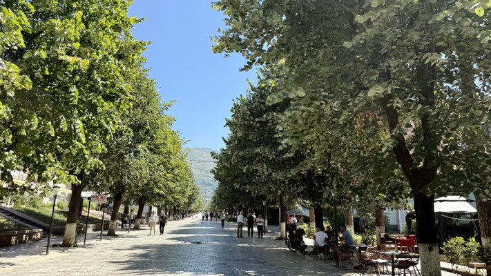 Ab dem Ort Arraz führte uns die Teerstraße schnell zum Ort Peshkopi. Dort bummelten wir über die mit alten Linden gesäumte Fußgängerzone mit vielen Bars und Cafés. In einer anderen Straßen waren dann die Geschäfte wie Friseur oder Haushaltsbedarf zu finden.