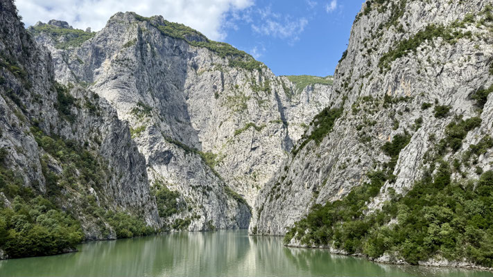 Die Fahrt dauert 2 Stunden, wir saßen auf dem obersten Deck und hatten dadurch einen guten Blick rundherum. Aber schon nach kurzer Zeit holten wir unsere winddichten Jacken, denn es war ein starker und kalter Gegenwind. Der See zieht sich als langer Schlauch über 34 Kilometer durch das schmale Tal des Drin und ist kaum je mehr als 400 Meter breit. An den schmalsten Stellen ist der See nur etwa 50 Meter breit, hohe Felswände rechts und links. Diese engen Schluchten erinnerten uns stark an die norwegischen Fjorde. Einige Häuser, wohl auch extra für Feriengäste, haben wir an den Hängen gesehen. Ein Zugang ist nur über den See mit einem Boot möglich. Landschaftlich war das heute eine sehr schöne Seefahrt.