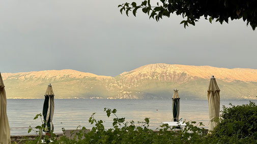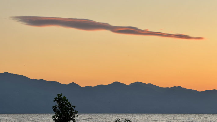 Wie vorhergesagt kam am Nachmittag ein heftiges Gewitter mit Regen. Danach kühlte es sich merklich ab. Erst am Abend strahlte die Sonne auf die Nordmazedonische Seite des Sees und beleuchtete den 2.255 Meter hohen Gipfel des Magaro.